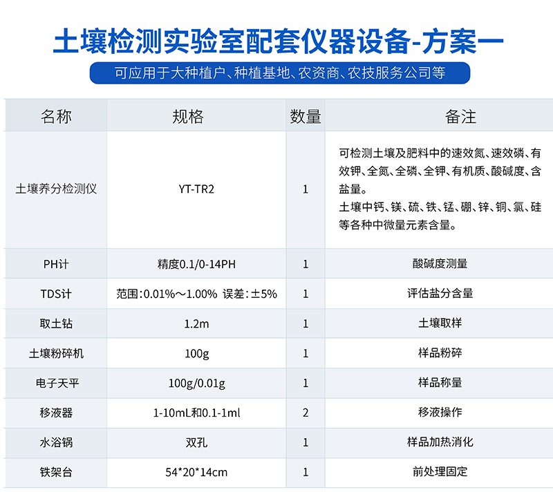 1、土壤養分:●土壤銨態氮、土壤有效磷、土壤速效鉀、土壤硝態氮、土壤水解氮、土壤全氮、土壤全磷、土壤全鉀、土壤有機質(丘林法)、土壤有機質(浸提法)、PH值、含鹽量、水分。●土壤中微量元素:土壤鈣、土壤鎂、土壤硫、土壤硅、土壤硼、土壤鐵、土壤銅、土壤錳、土壤鋅、土壤氯;●土壤重金屬:土壤鉛、土壤砷、土壤鎘、土壤鉻、土壤汞。